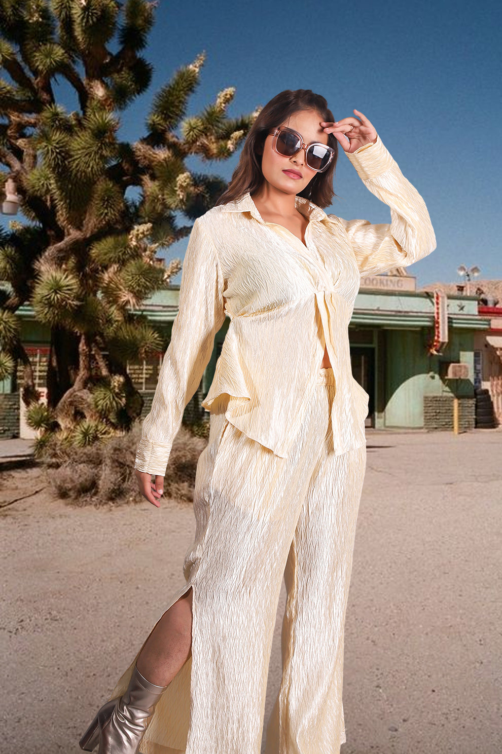 Elevate your wardrobe with this stunning Champagne Textured Satin Co-ord Set from Tannya Amazing Design. This ensemble features an elegant, relaxed-fit tie-front shirt paired with wide-leg pants and stylish side slits―perfect for making a statement at brunches, festive gatherings, or your next getaway. The soft, flowing satin-textured fabric in a luminous beige hue ensures effortless glamour and ultimate comfort. Pair it with metallic heels and chic sunglasses to complete the look.