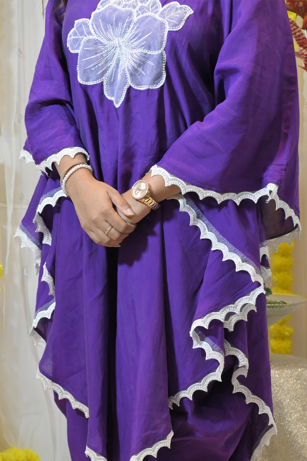 Designed with graceful silhouettes and intricate embroidery in traditional tilla and gota work, this festive dress blends heritage craftsmanship with modern sophistication. The flowing drape and refined detailing make it a perfect choice for Rakhi celebrations, family gatherings, and the festive season.