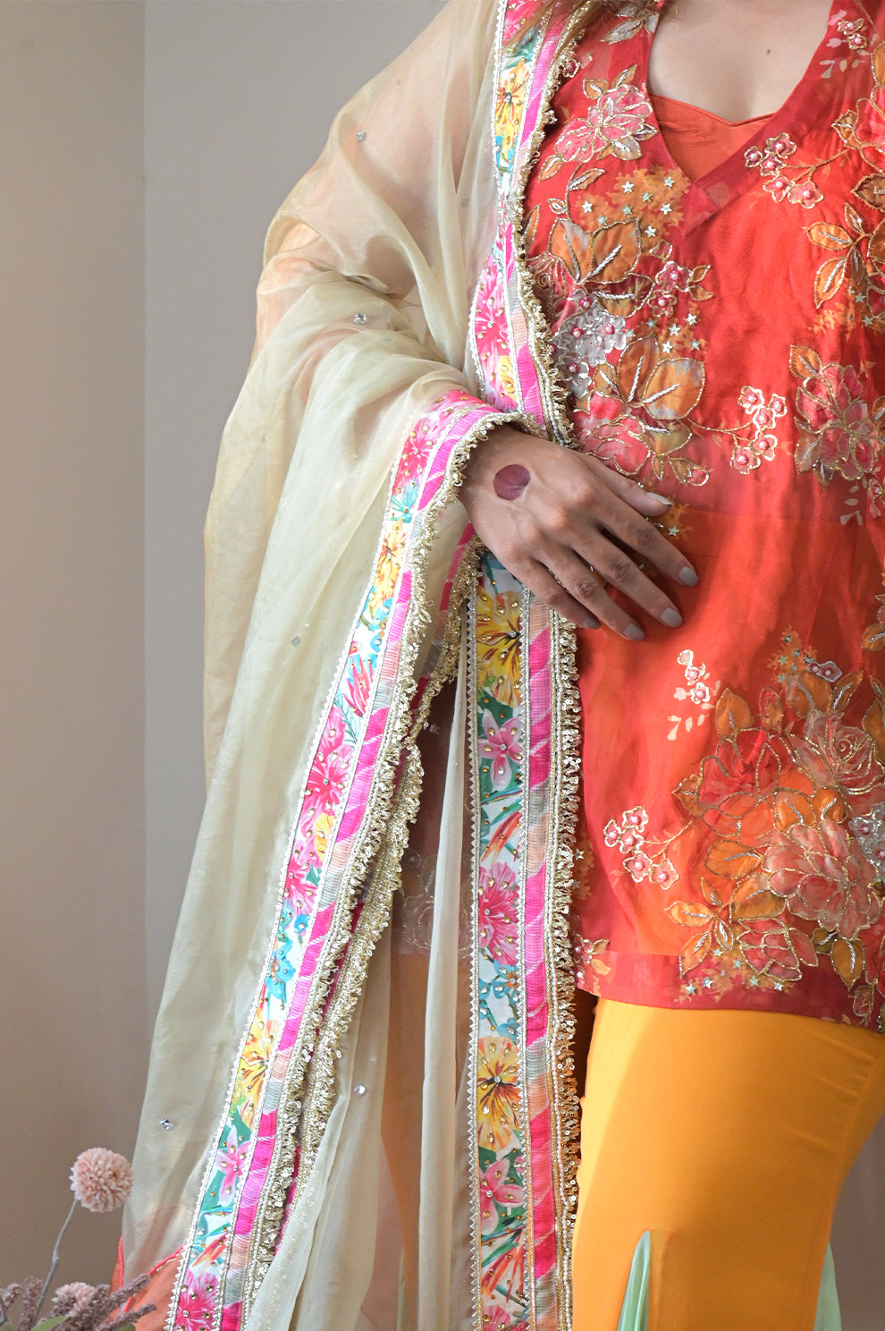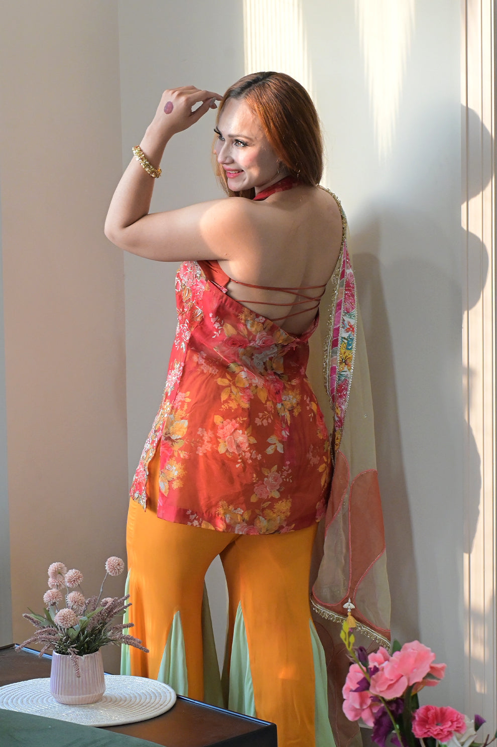 - Step into celebration and elegance with this vibrant Shrara Set, designed especially for Karwachauth festivities. The outfit features a halter-neck top in rich rust orange with floral embroidery, paired with contrasting yellow sharara bottoms accented by mint green panels. A cream net dupatta with colorful floral borders and delicate lace adds a touch of grace, making this ensemble the perfect blend of traditional and contemporary fashion.